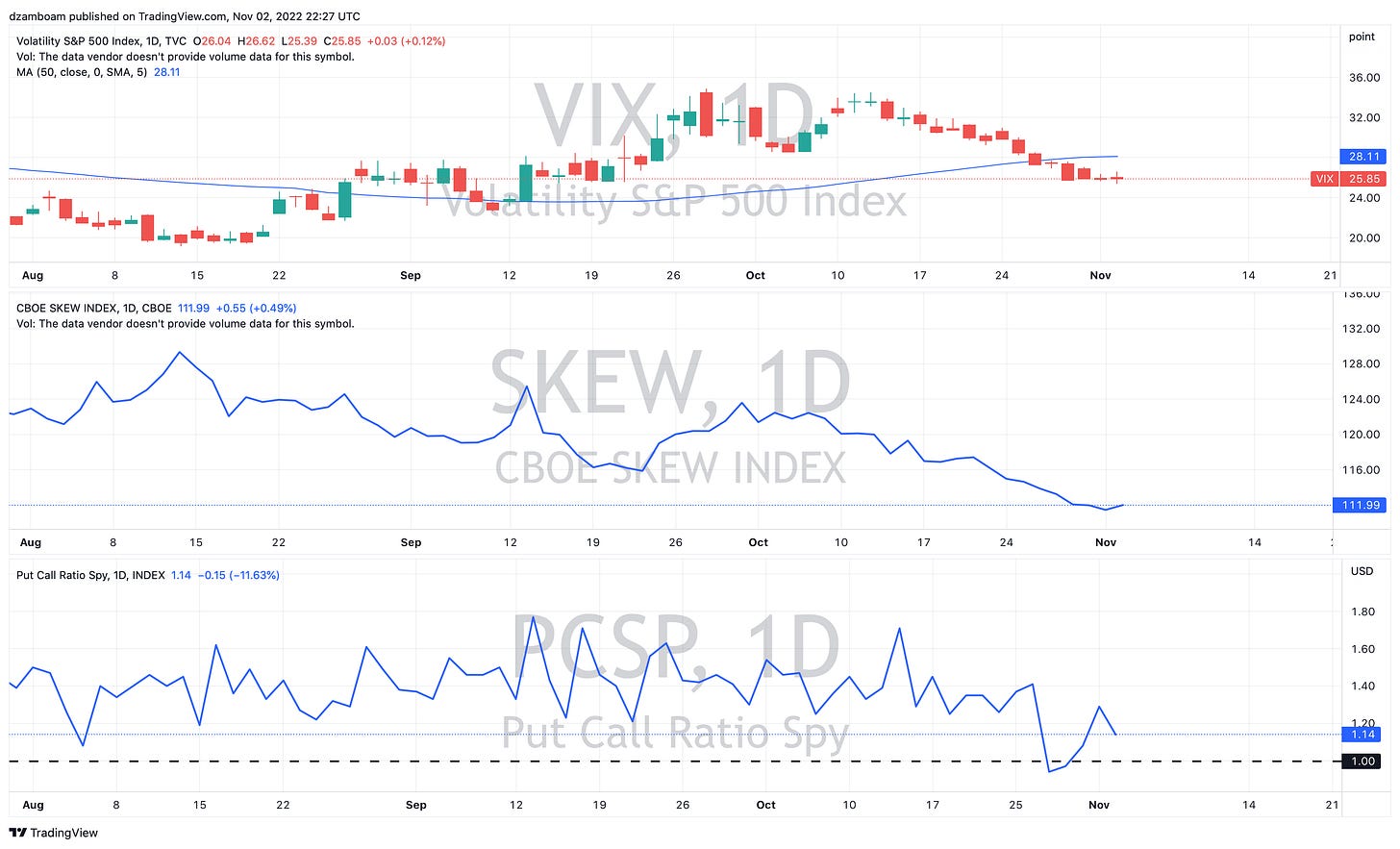 There are many possible explanations for why VIX barely budged today… however, the decrease in P/C ratio indicates more puts being sold than calls (or more calls being bought than puts) while SKEW indicates limited out-the-money option buying. Demand for out-the-money options will need to increase to see VIX climb.