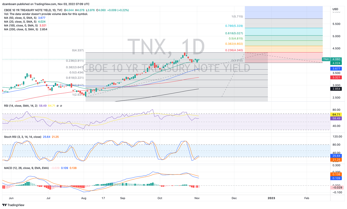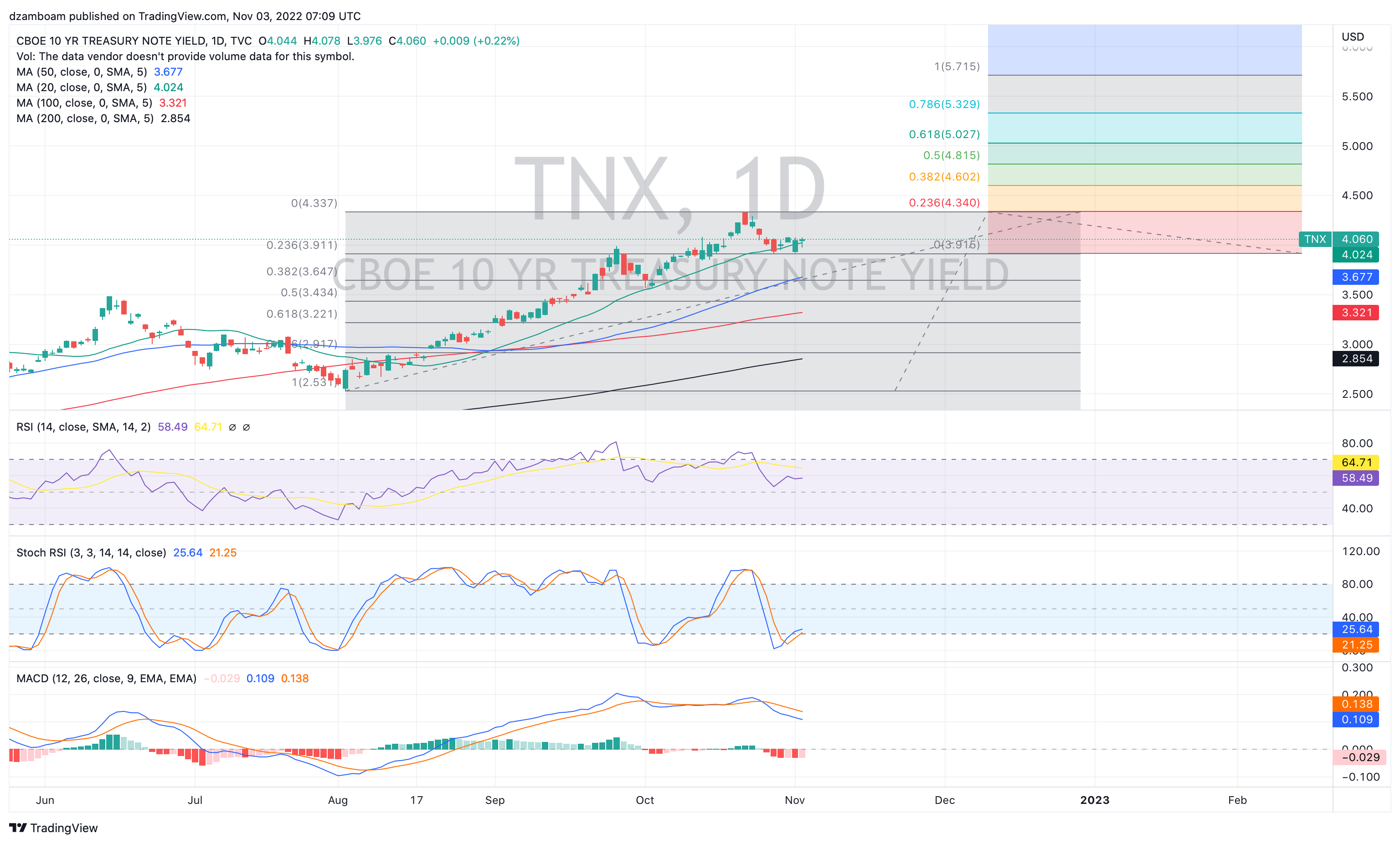In my opinion… even with what the chart suggests, going higher than 4.33% seems unfathomable given the market-wide implications these high yields have. The long-term SPX dividend yields is 1.85% by comparison, so really, any 10Y yield above 4% for an elevated period of time may at some point entice investors to take advantage of the higher-yielding 10Y treasuries rather than equities.
