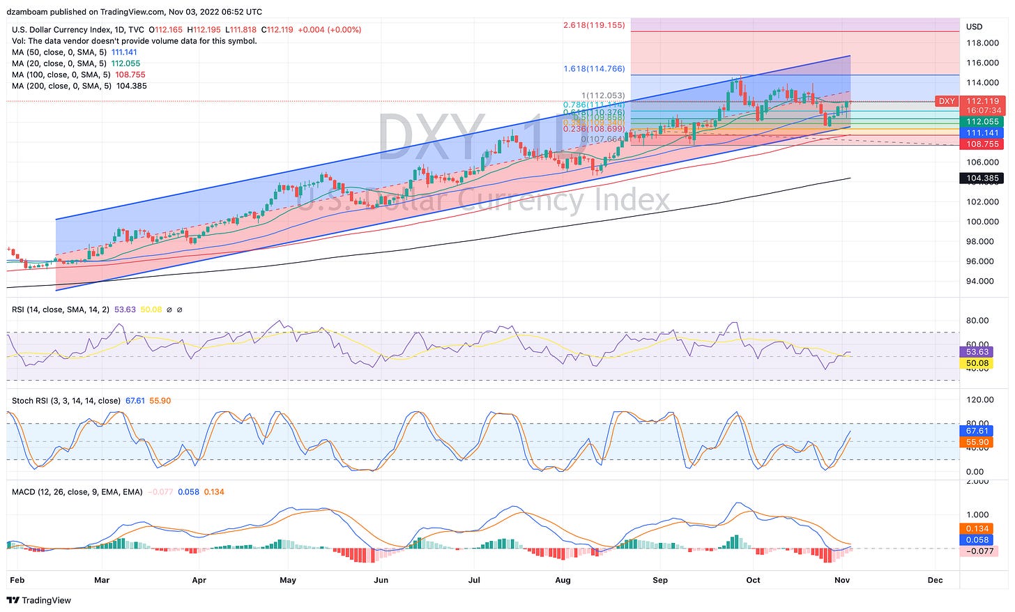 The DXY has been on a massive bull run all year, and has respected the boundaries of the above channel. With DXY up on the day, it’s still in the lower boundary of the regression channel, meaning it has room “up” to get back to the average. This would put the DXY close to 113. The upper part of the channel intersected with the 161% in mid-September. If the DXY is to intersect the top of the regression channel as well as its next major Fibonacci extension (261%), this would take place sometime between mid-December and early January. Continued weakening of other currencies (e.g., the JPY, CNY, GBP) would need to continue for this to be possible.